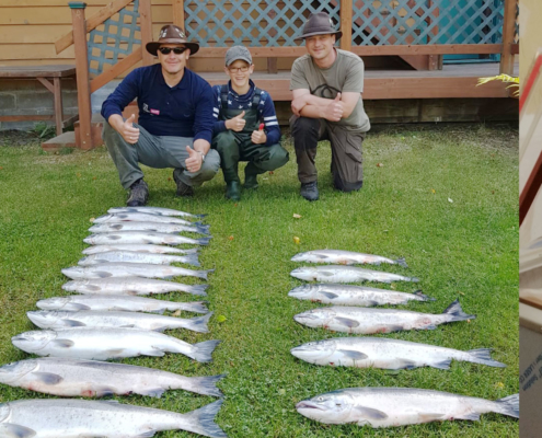 The season 2022 has been a great success … Red Salmon (Sockeye) startet second week of July, and guests have been limiting on Sockeye (6 a person a day), and Silver Salmon (Coho) – even without bait – right from our walkways till August 22nd. It has been a sensational year, and the feedback from the guests have been wonderful.
